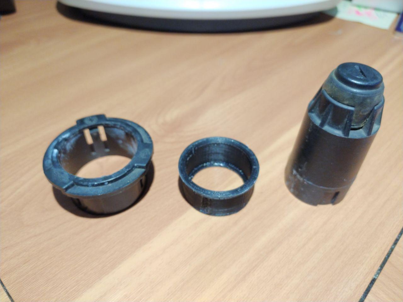 Eine der Stützen, die bei einem Unfall in sich zusammen brechen sollen, aber die Haube stützen, hatte sich ohne für erkennbaren Grund zerlegt. Ersatzteilneupreis: 13 - 20 Euro. Für ein solches Teil vollkommen unrealistisch. Also repariert man es selbst. Kleben fällt bei diesem Kunststoff aus. Nachdem man die alten Haltenasen weg geschliffen hat, steckt man das Druckteil in das Unterteil (Öffnungen für Nasen beachten) und schiebt dann das stützende Teil ein.