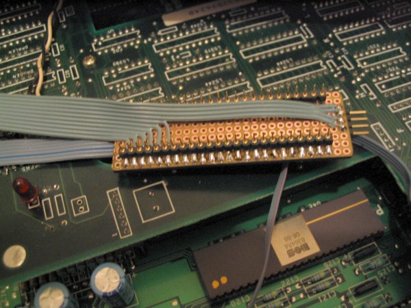 Als erstes kommt der Kickstart-ROM Adapter rein. Ich wollte ursprünglich zwischen dem echten Kick und dem BootROM des A1000 umschalten können, das werde ich evtl. später einmal nachträglich machen. Als Grundlage dient der im A1k A1000 Bereich vorgestellte "Hack", einen echten Kickstart-ROM in den A1k einzubauen, wie auch der vom Mitglied Ratte umgesetzte Adapter.