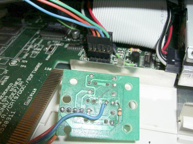 Um den fehlenden Stift einzusetzen, habe ich das Board umgedreht, den unbelegten Pin von Lötzinn befreit, einen Stift durchgeschoben, und diesen angelötet. Dann von einem Reset-Taster-Kabel aus nem PC den blauen Draht genommen, in den Stecker gesetzt, auf der Platine die Brücke zwischen den LEDs für die Floppy durchtrennt, die nun Floppy-LED nach Masse gebrückt, und einen 33 Ohm Widerstand und den blauen Draht auf die nun freie LED gelötet.