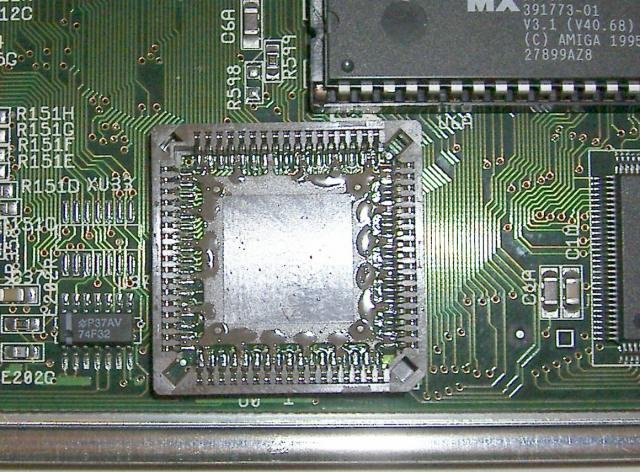 Die 2 Widerstände einlöten und einen Stift in den freien Platz in die Stiftleiste, oder direkt am Transistor abgreifen (einzelner Pin) und eine LED gegen Masse mit geeignetem Vorwiderstand. Im Falle der Amiga-LEDs sind es 33 Ohm.
